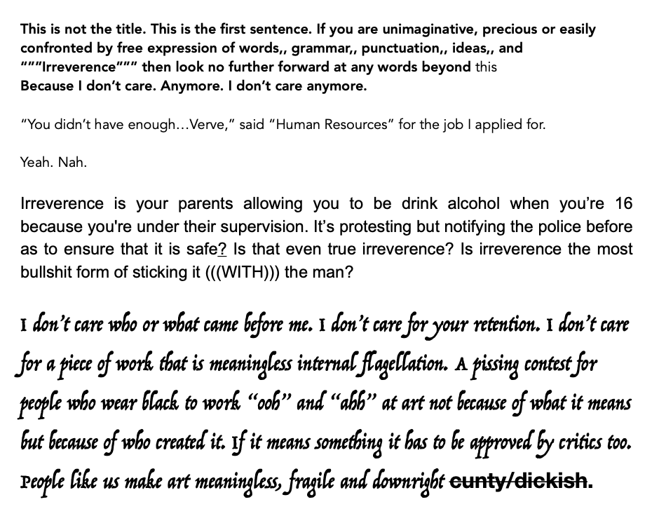 Irreverence is a term placed on someone from an external source. We never really know what it is to be irreverent. I thought how could I create the closest thing to pure irreverence whilst consciously doing so? I used multiple fonts and colours because you shouldn't. There is limited structure, terrible language and frankly confronting aggressive tones all throughout the essay (Confrontation being an aspect of irreverence).