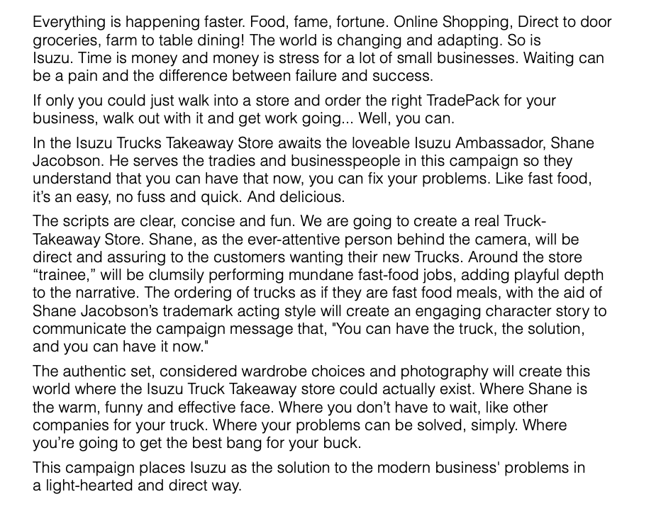 //Reason: Isuzu wanted to shoot an Ad. The Producers asked me to write copy for them as well as proofread the Directors’ Treatment.